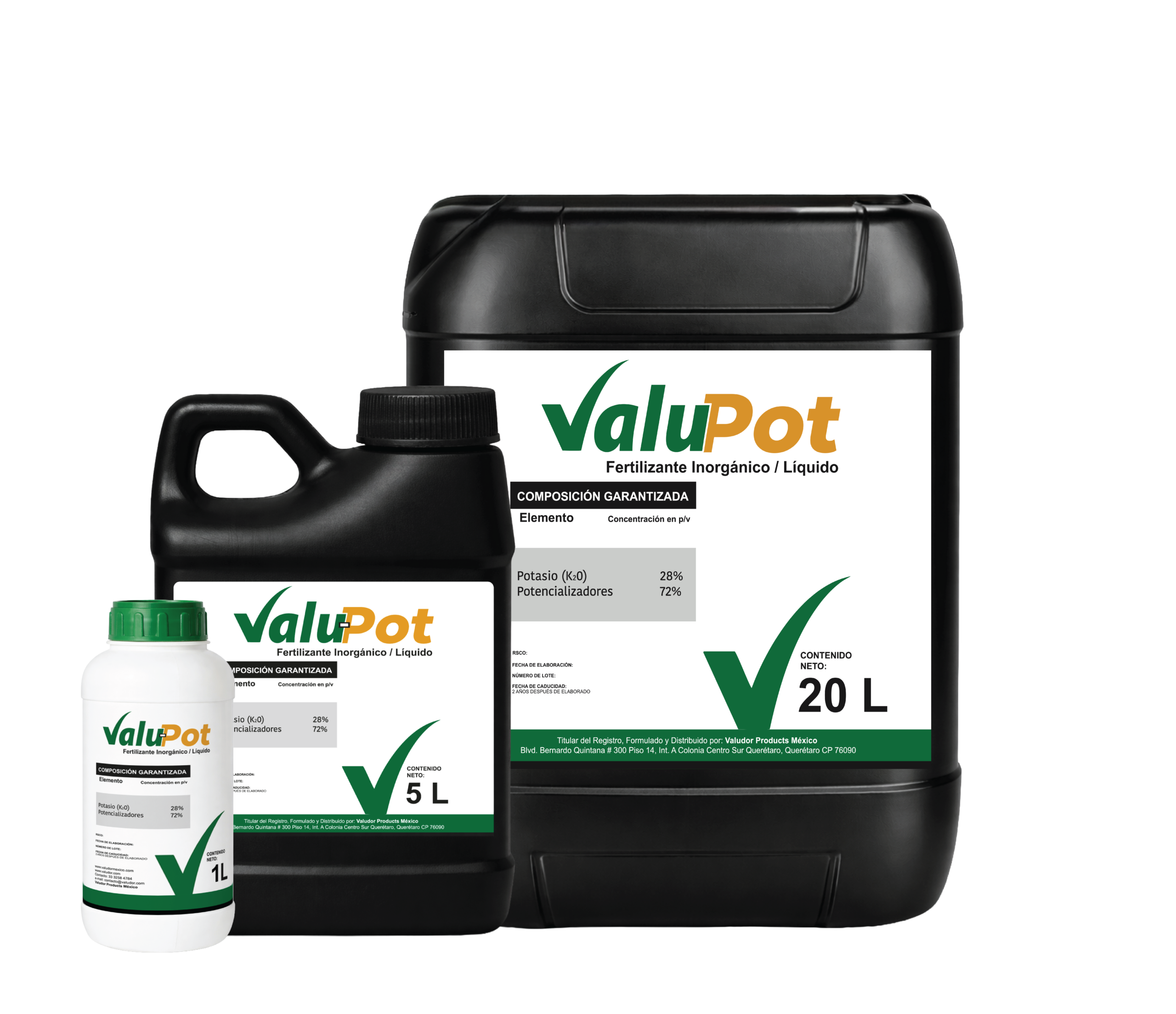 Valu-Pot es un fertilizante líquido a base de potasio con una concentración aproximada de 28% de unidades formadoras de potasio (acetato de potasio). Es un fertilizante sin nitrógeno, sin sulfatos, lo que evita un exceso de crecimiento, vegetativo, optimizando así la floración y producción de frutos.