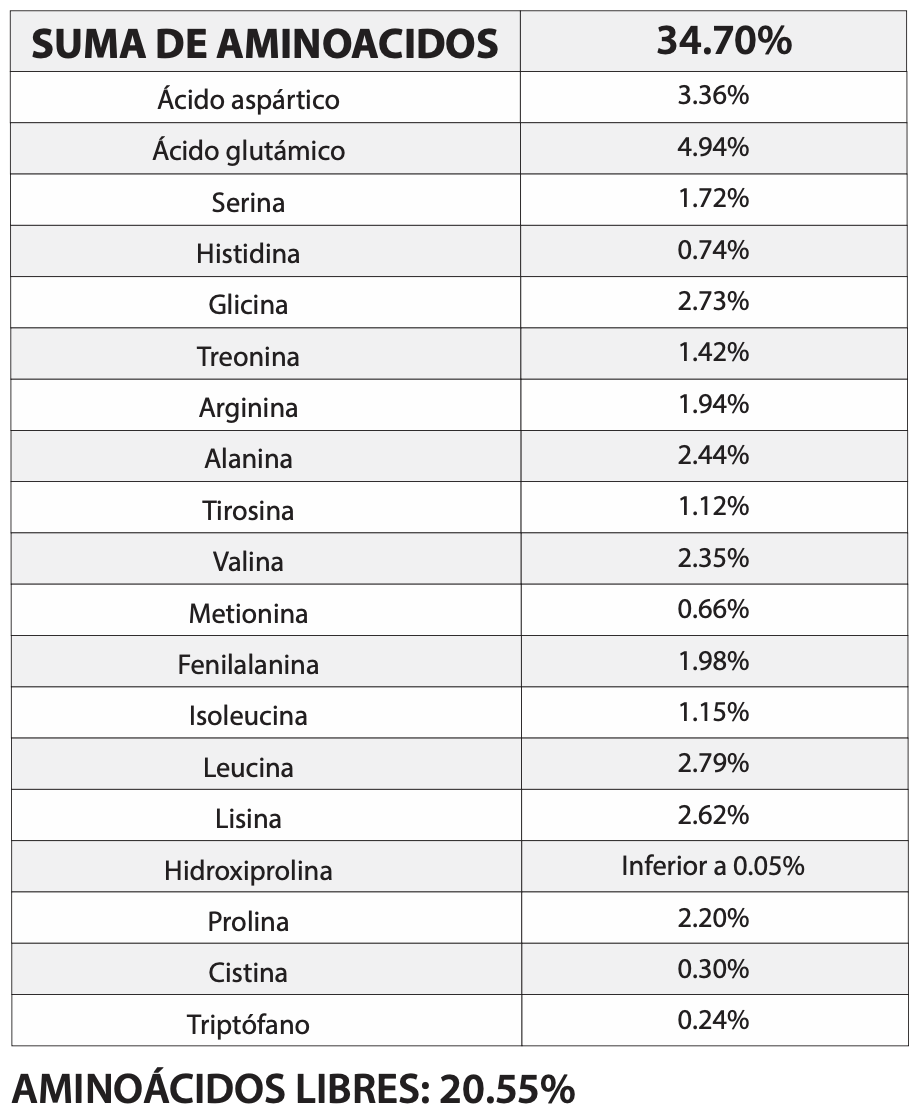 Aminoácidos totales (Aminoácidos libres 20.5 %)………………….34%